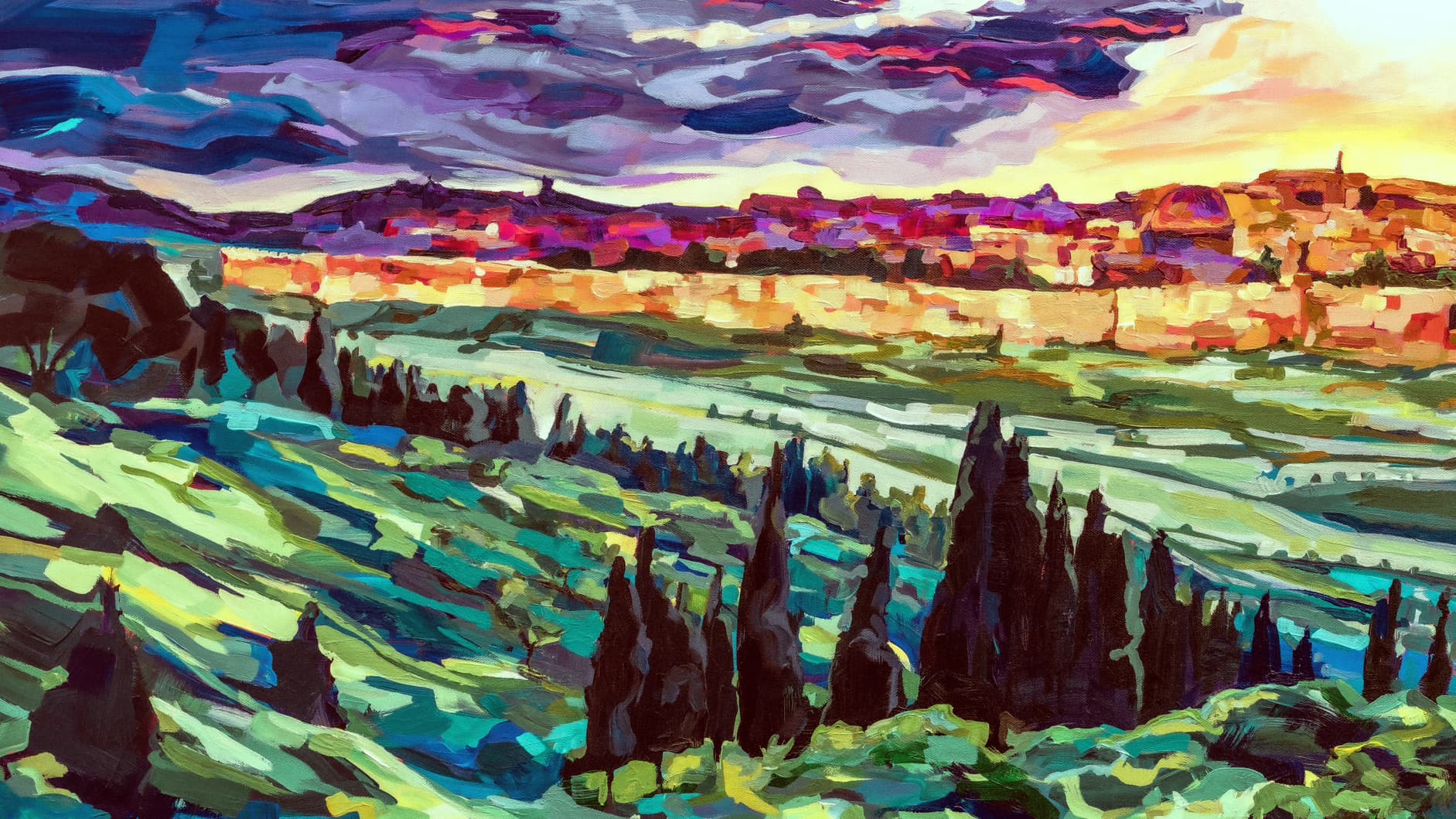 Each color of the spectrum vibrates at a specific frequency. As an artist, manipulating pigment is like playing with a symphony of energies. Connect with the heightened energy of the Holy City of Jerusalem. May this vibrant painting brighten your space!