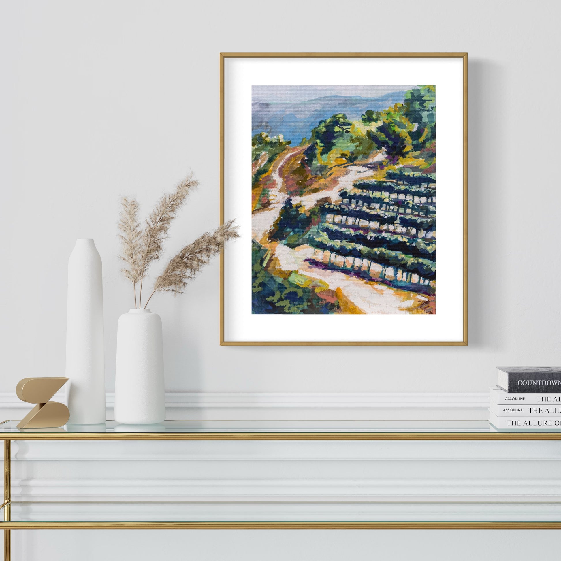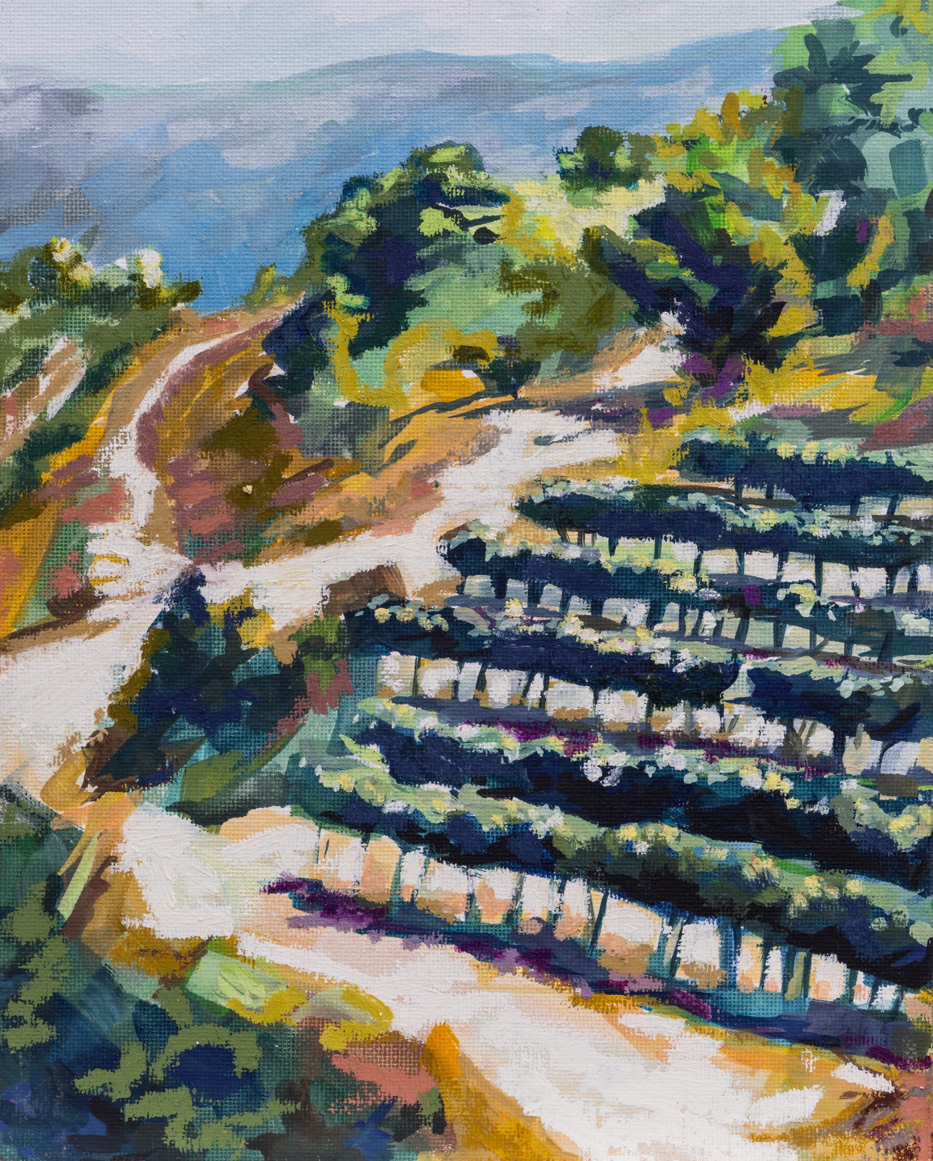 This landscape painting is inspired by the rolling hills outside Jerusalem and abundant vineyards of Gush Etzion. I loved the way the atmospheric perspective tinted the mountains in the distance many shades of blue and grey. Depicted in the foreground are fruitful vines dripping with grapes, one of the seven species special to the Land of Israel. This piece will bring the beauty of the fruitful Land of Israel to your home.
